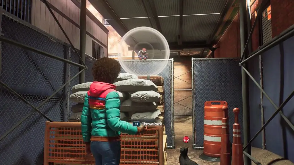 From the previous graffiti location, turn right and walk on the wooden plank to cross the gap. The wooden plank will break midway and you will fall down. Climb up the wall ahead. Then turn left and you will see a Spiderman toy on top of the fence. Throwing a stone at the toy will make it fall down and the cat will go and grab it.