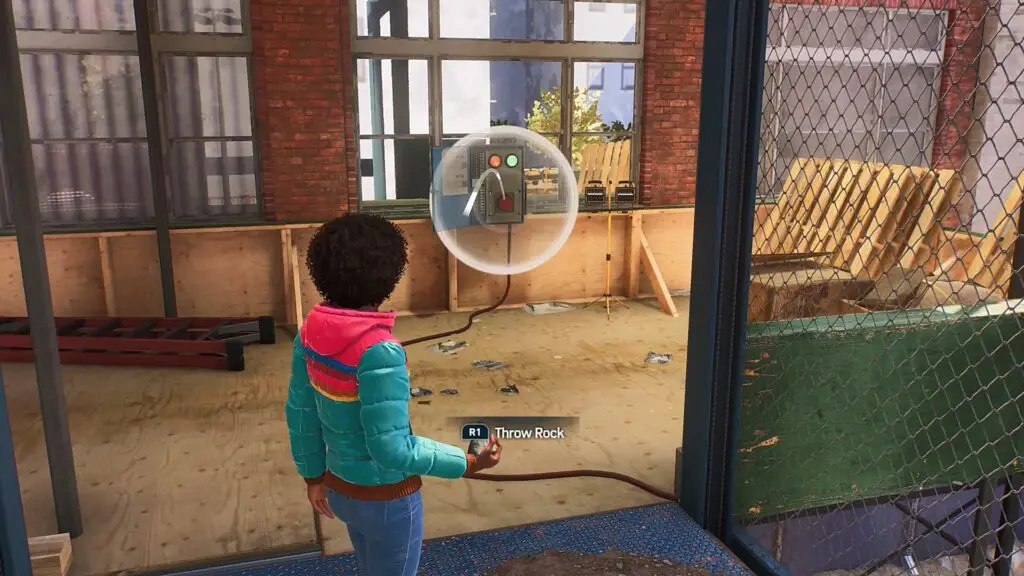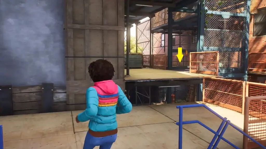 Proceed ahead and walk over the wooden plank hugging the wall to cross to the other side. There you will find a red button. Press it to send the elevator down. Then stand at the top of the elevator. Grab a stone and throw it at the red button as shown in the picture below. This will take you up along with the elevator. Then climb up the wall ahead and draw the final graffiti. This will complete the request.