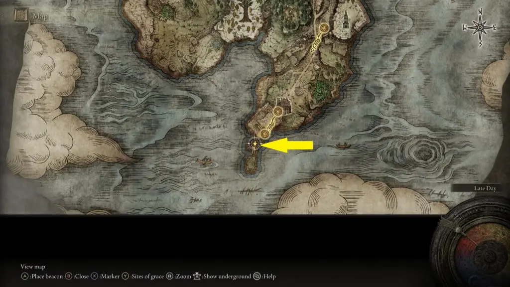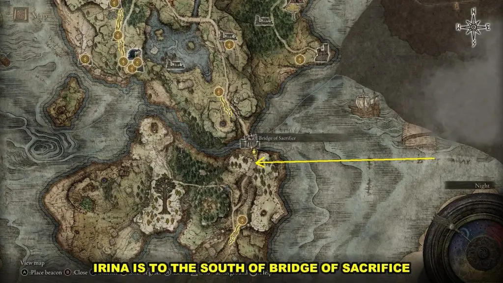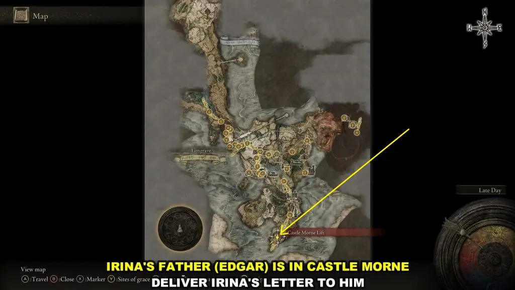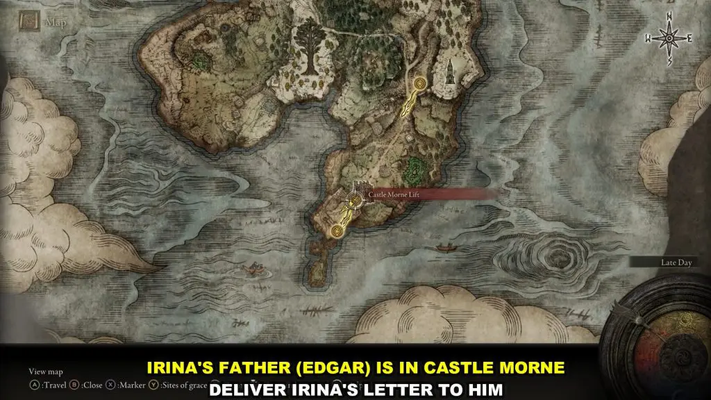 Irina’s Father is in Castle Morne, which is on the southern side of the Weeping Peninsula as shown in the pictures below.