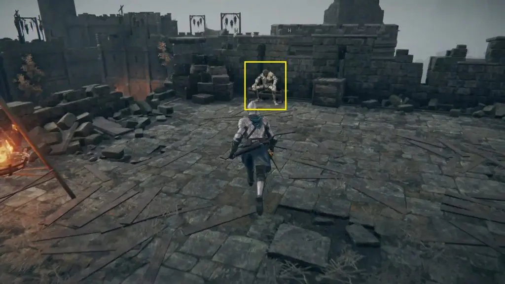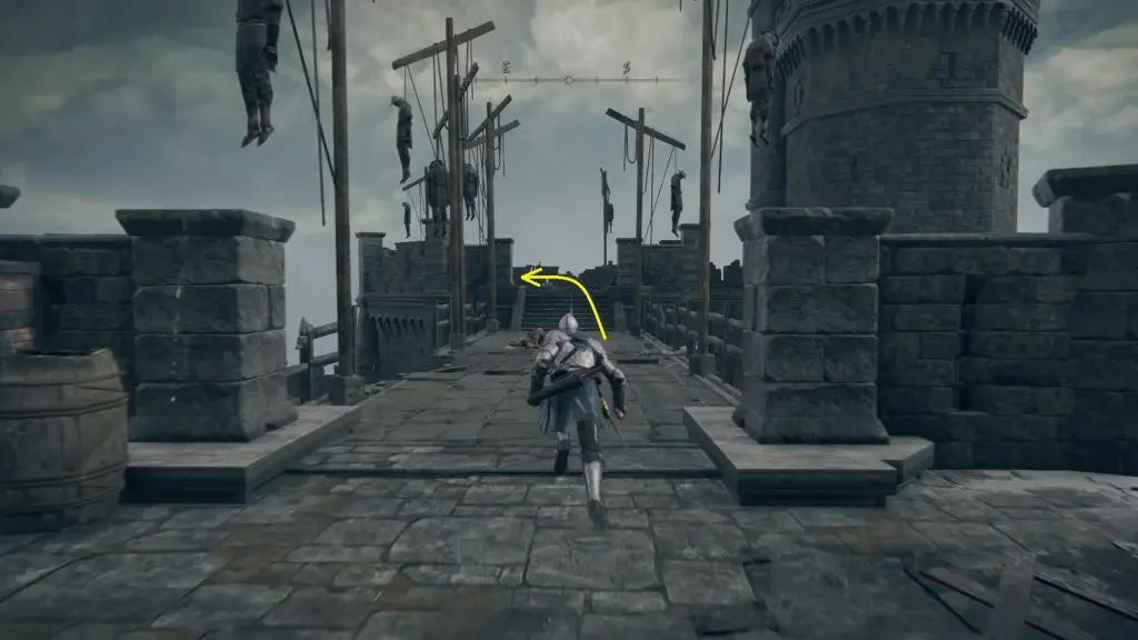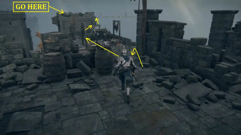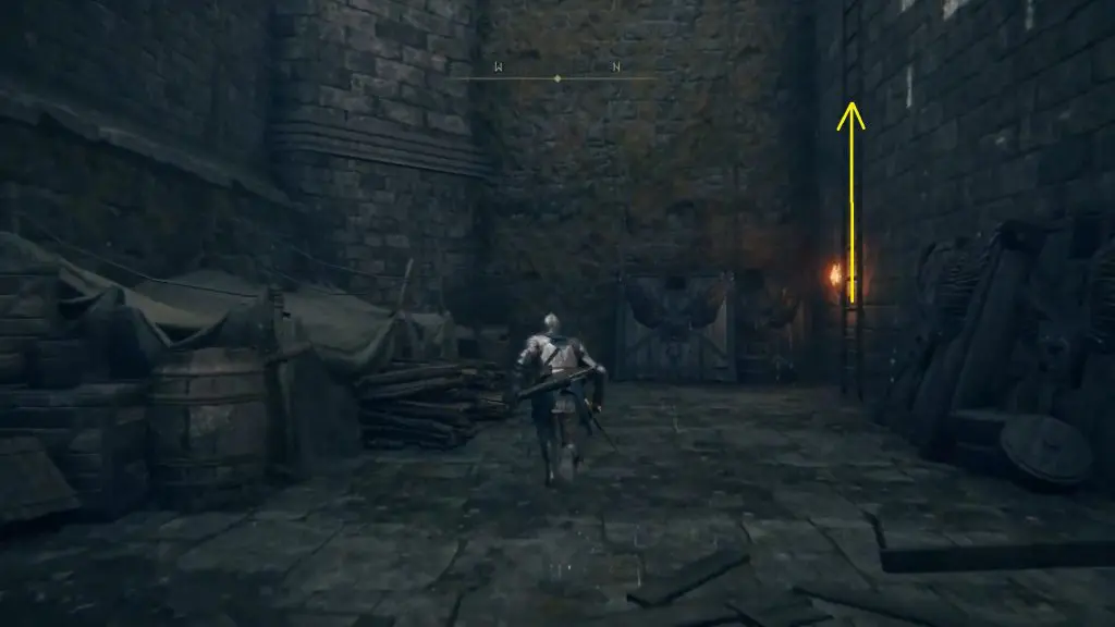 Enter the castle through the main gate and go straight. Turn right when the path ends as shown below. After turning right, go straight ahead and climb up the ladder at the end of the path as shown in the second picture below.