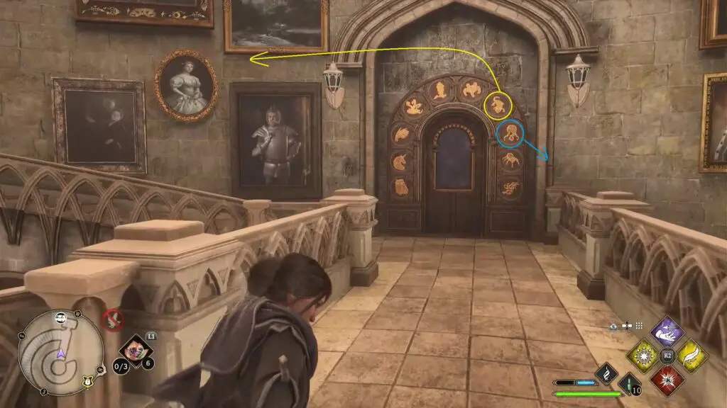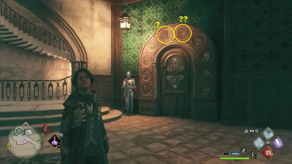 Head south from the Floo Flames, go through the big red door on the right, and go upstairs to the locked door. Using the Door Guide, enter (0) and (10) for the ? and ?? blocks to unlock the door.