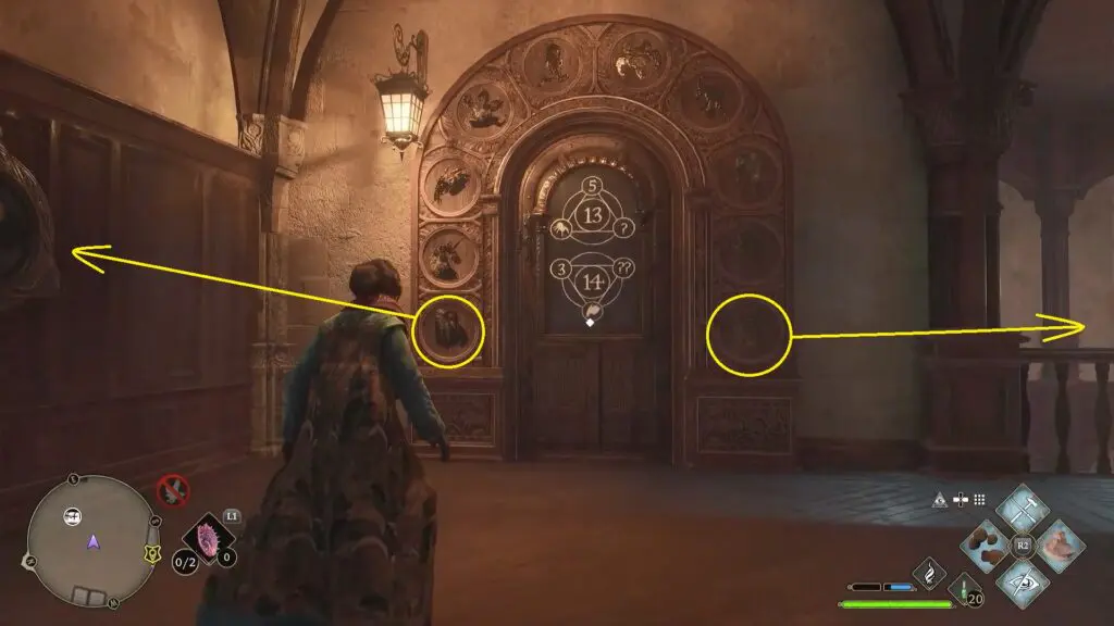 Head west from the Floo Flames to locate the locked Arithmancy Doors. Using the Door Guide, enter (4) and (5) for the ? and ?? blocks to unlock the locked Arithmancy Doors