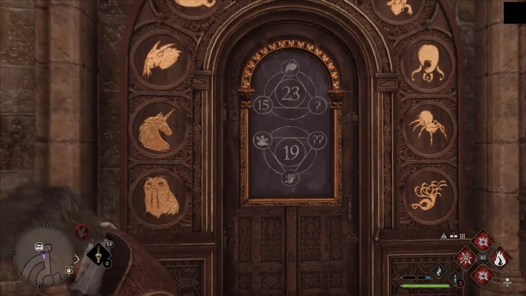 This guide shows how to open the locked door in the Grand Staircase Tower in the Hogwarts Legacy game, which released on 10th February 2023. You will find a Collection Chest behind this door. The door will have creature symbols around it. Each creature around the door represents numbers 0 to 9 as shown in the second picture below. From the Grand Staircase Tower Floo Flame location, go down the stairs to find the locked door.