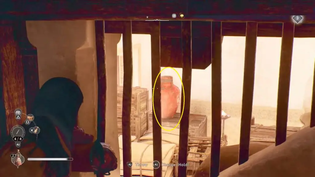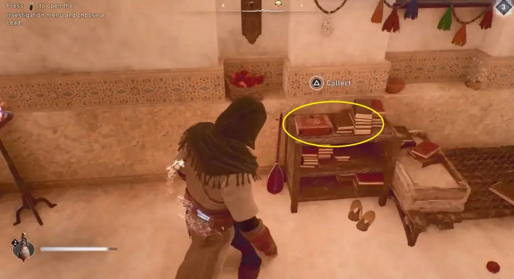 Once inside, head down the stairs and use your Throwing Knife to break the Fire Jar. This will make it explode and unlock the main door downstairs. Then, climb back outside and enter the building through the main door. You will find the book on a small desk.