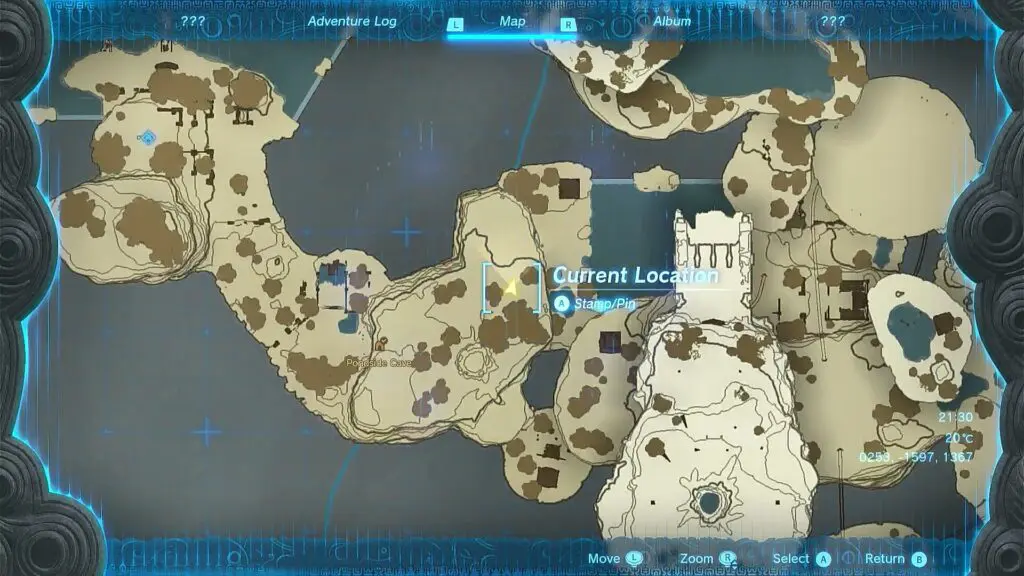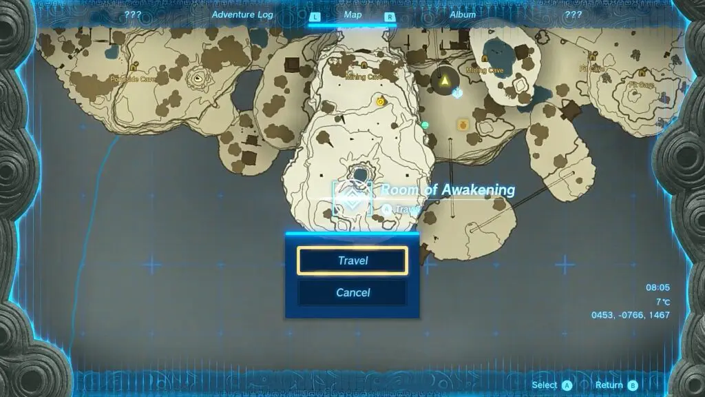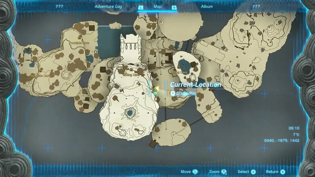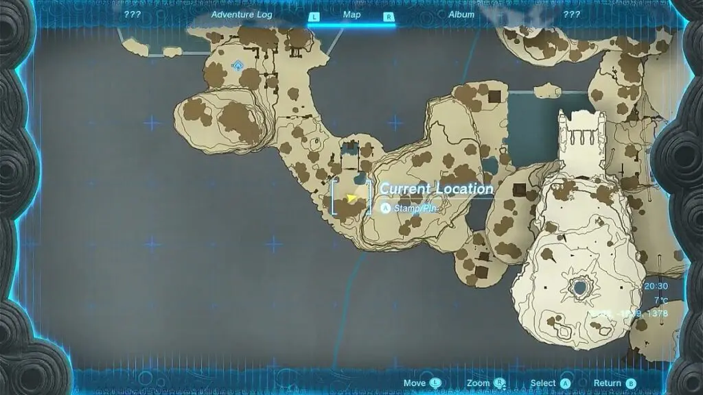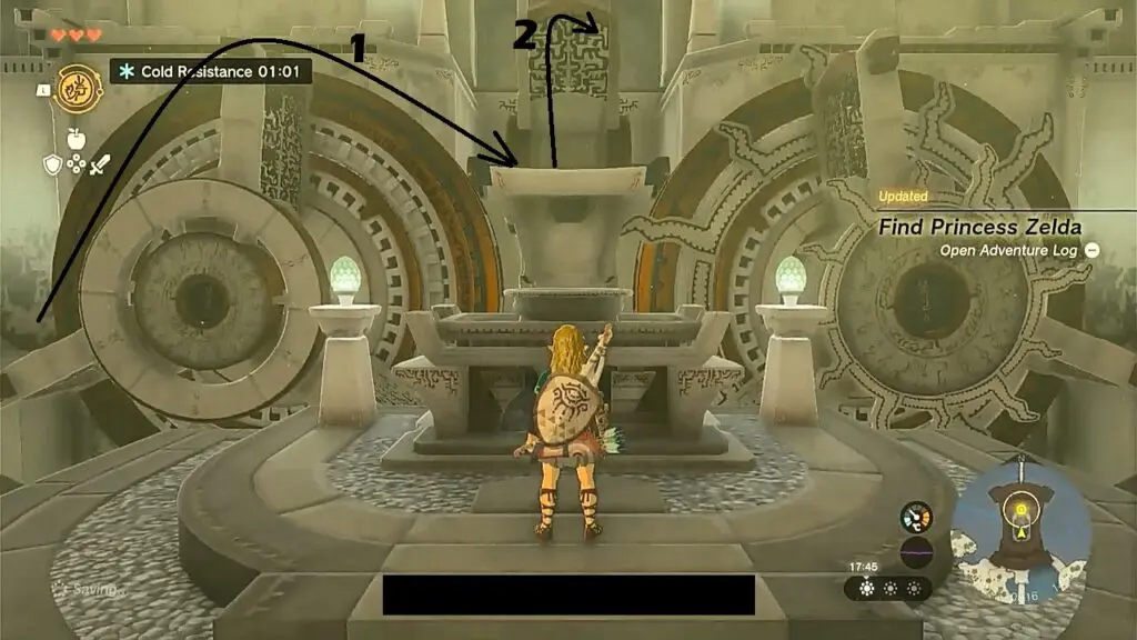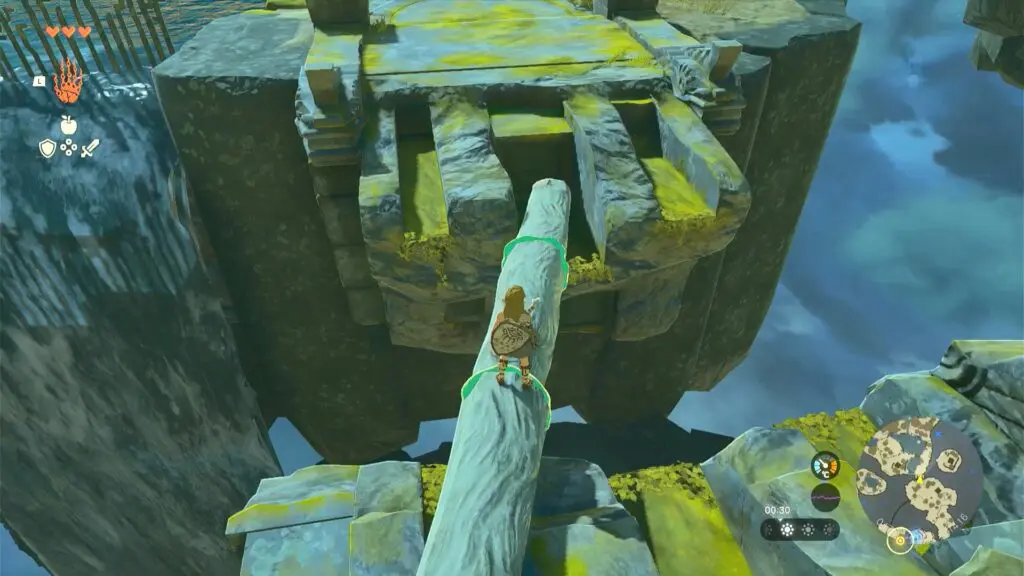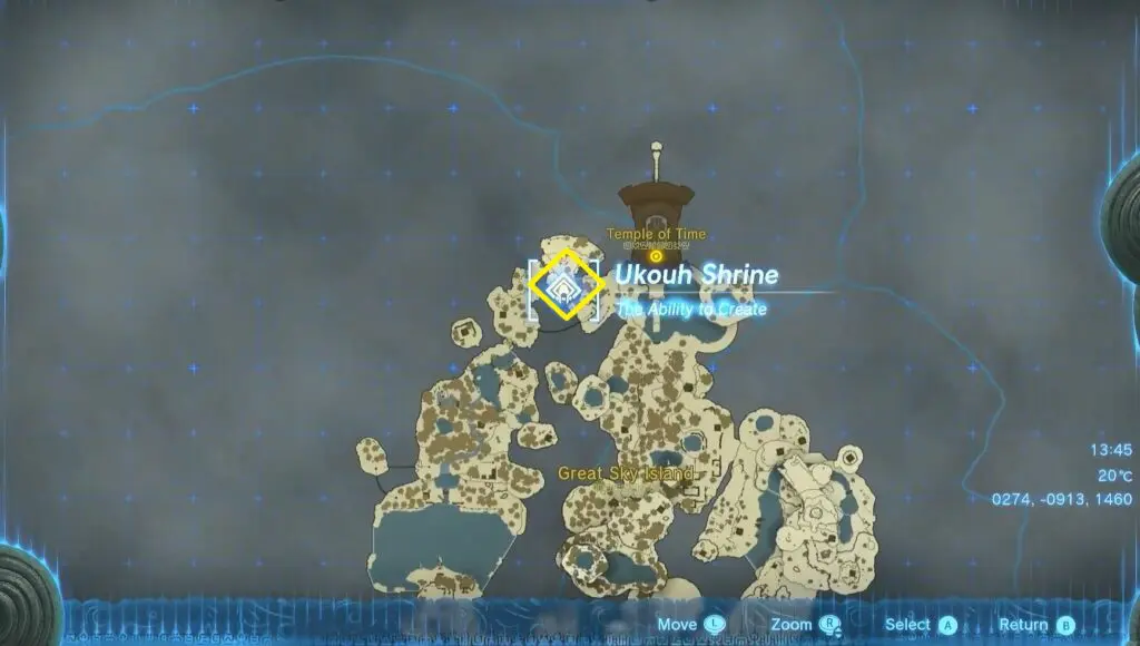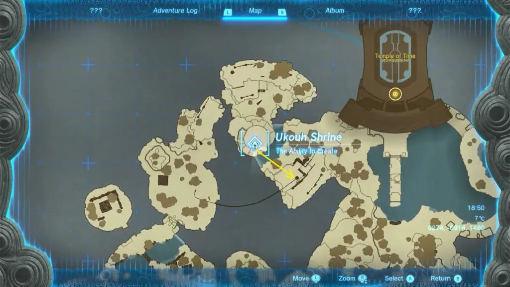 The quest starts when you are at the Temple of Time entrance. First, you have to make your way to the Ukouh Shrine, which is located near the Temple of Time as shown in the picture below. To reach there, players need to head southwest from the Temple of Time. Upon entering the shrine, players will gain access to the Ultrahand ability which enables grabbing, rotating, moving, and sticking them together.