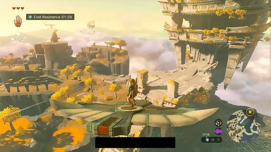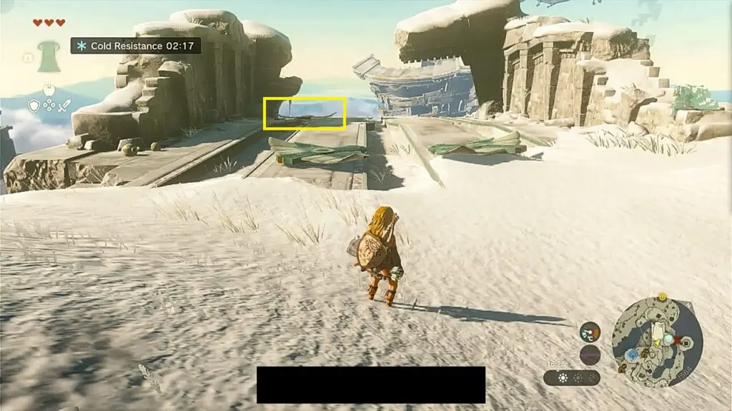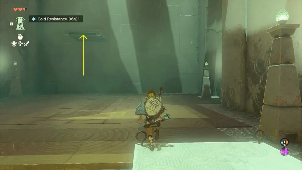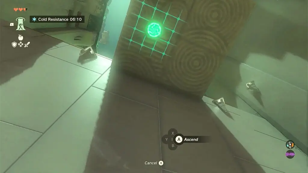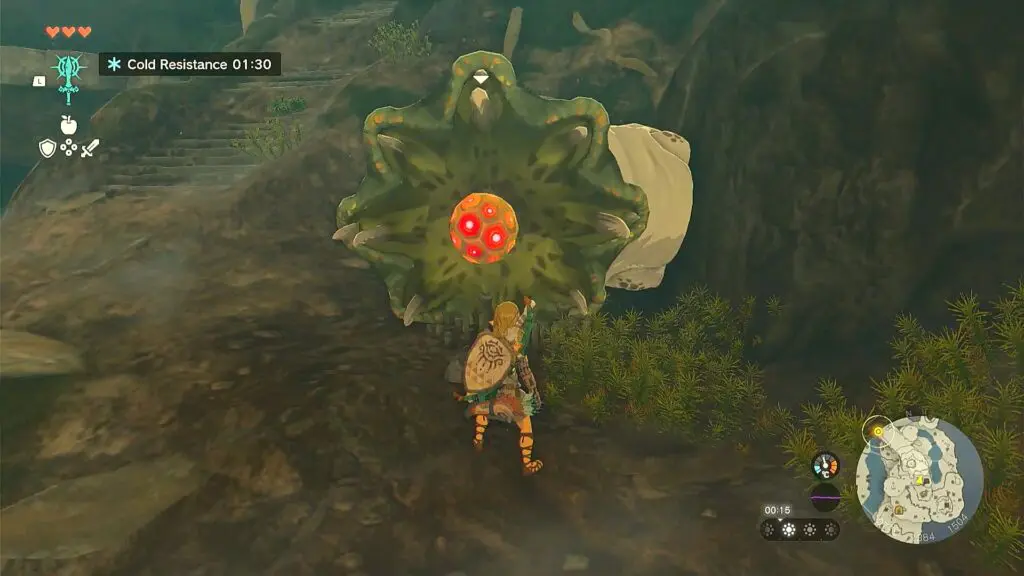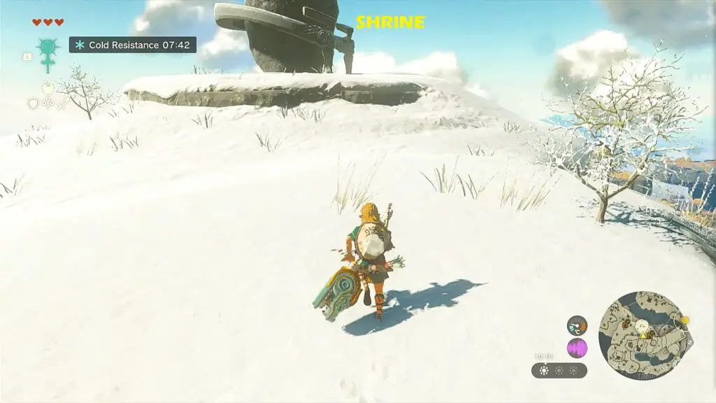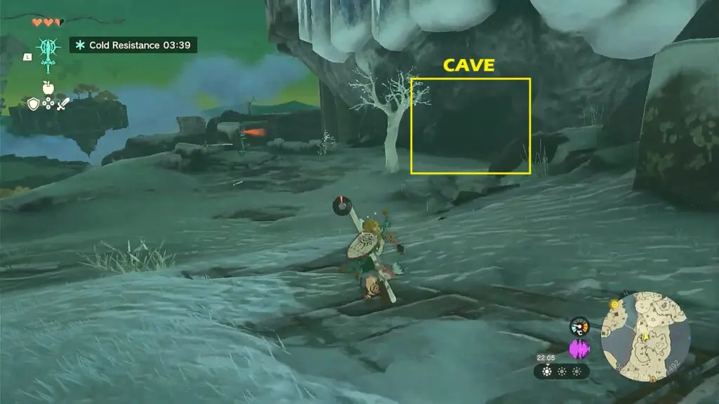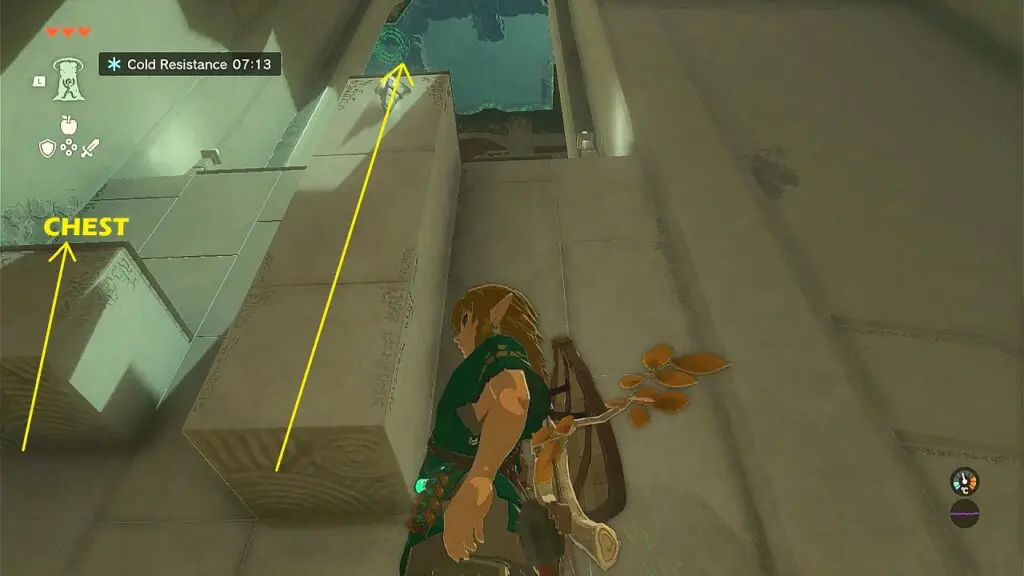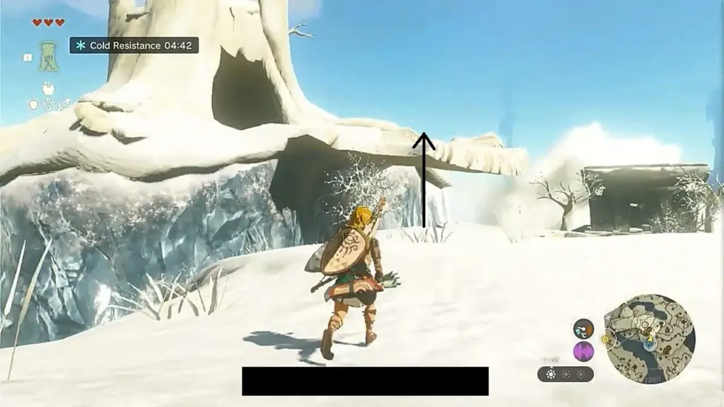 After completing the third shrine, ascend through the root as shown in the picture below. Then enter the tree trunk and open the chest there to get the Cold Resistance Gear and wear it.