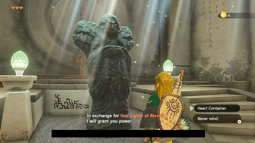 Fast travel to the Ukouh Shrine and make your way to the Temple of Time. Enter inside and go to the locked door. Interact with the statue in front of the locked door as shown in the picture below and you will receive a Heart Container. Now you can interact with the locked door and open it. Go outside and jump down to complete the area.
