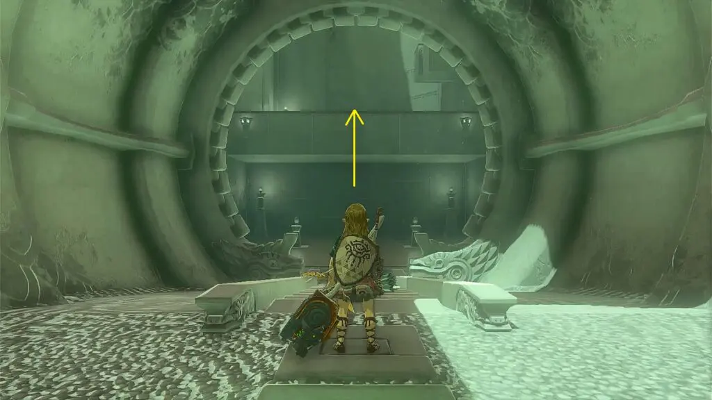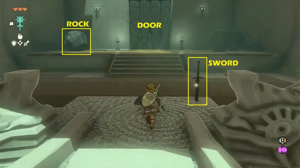 As you enter the shrine, you get the ability to combine (Fuse). Proceed ahead and pick up the sword in the next room as shown in the picture below. Fuse the sword with the rock in the room to make a hammer. Now use the hammer to break the stone door.