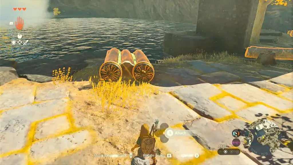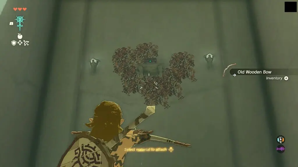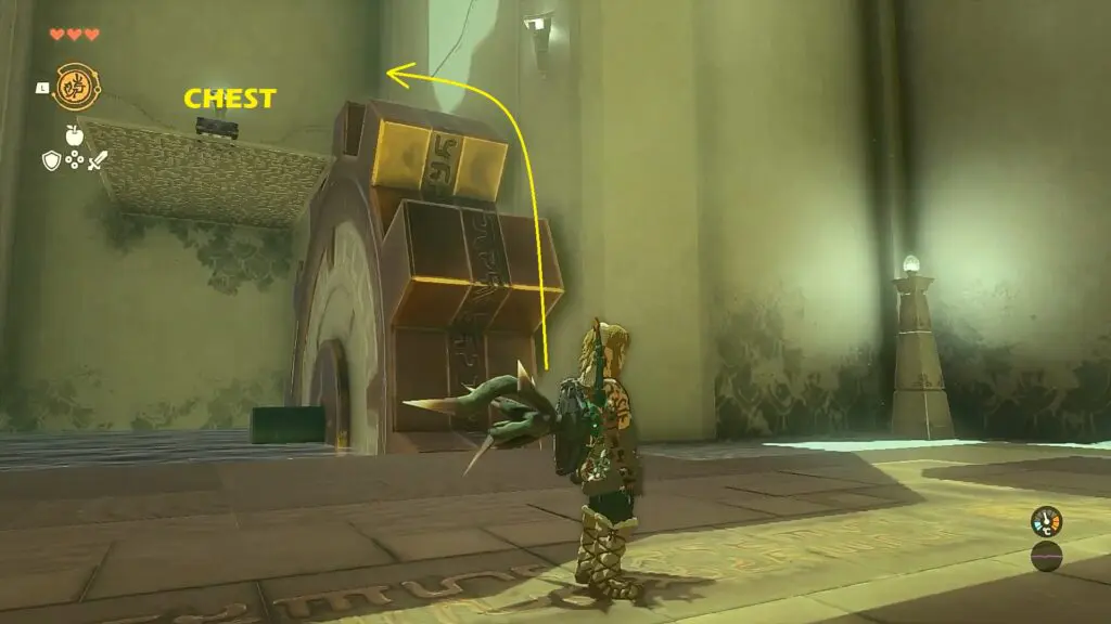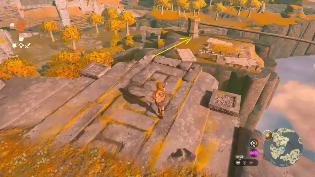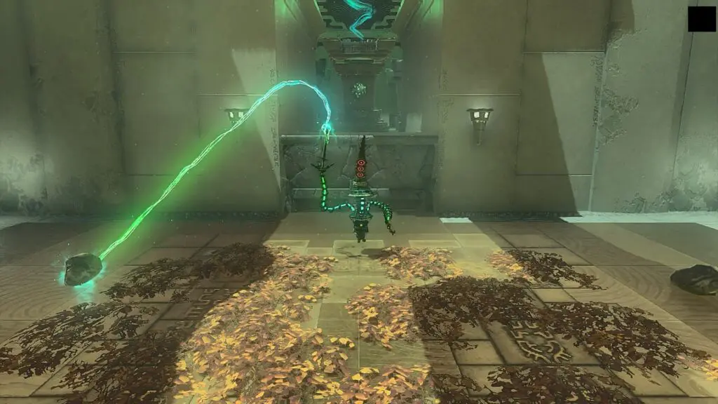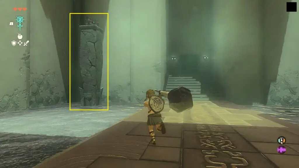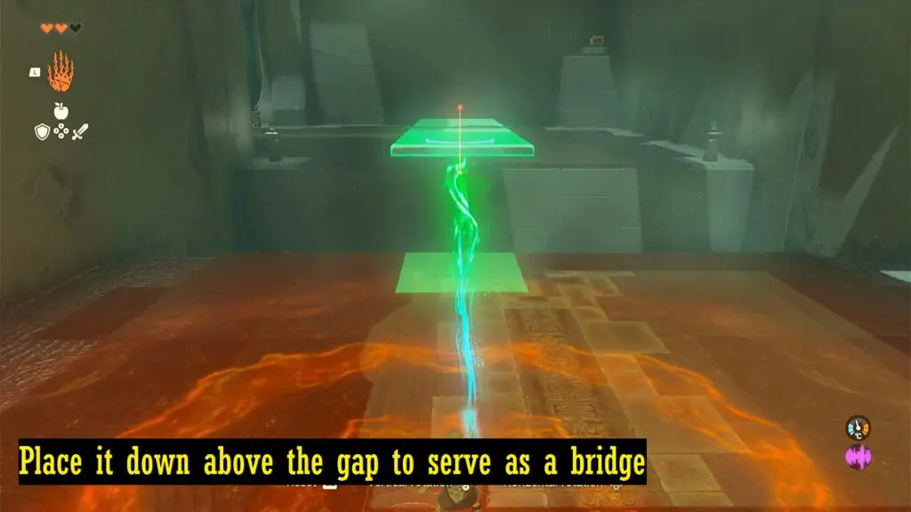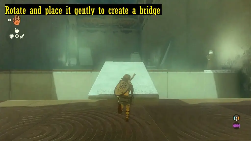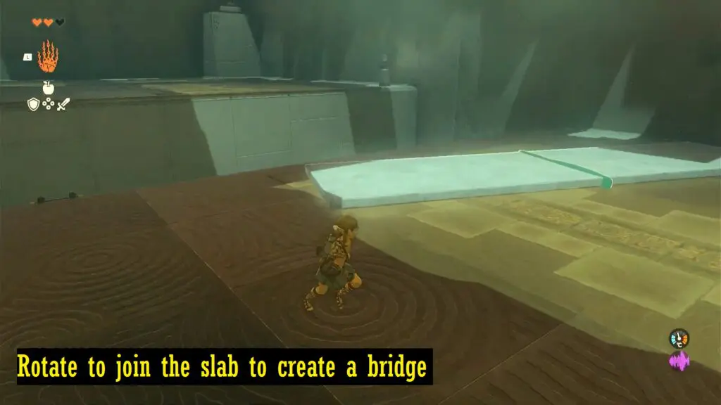 Head inside to find a stone slab lying on the ground. Here you need to create a bridge to go to the other side of the room. In order to build a bridge to the opposite side of the room, press L to activate Ultrahand and then grab the stone slab. Hold R to rotate the bridge, and then place it down.
