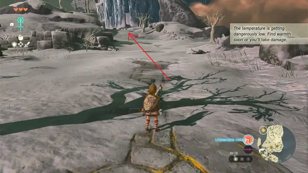 Proceed ahead into the cave and when you come out from the other side, you will find yourself in a freezing area as shown in the picture below. Eat Spicy Sauteed Pepper to get some cold resistance.