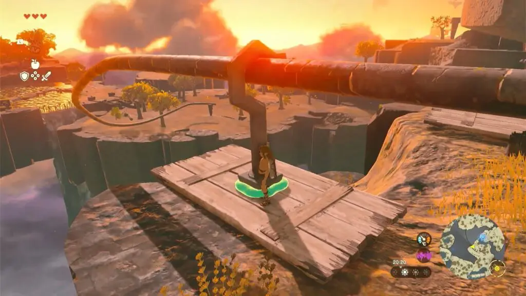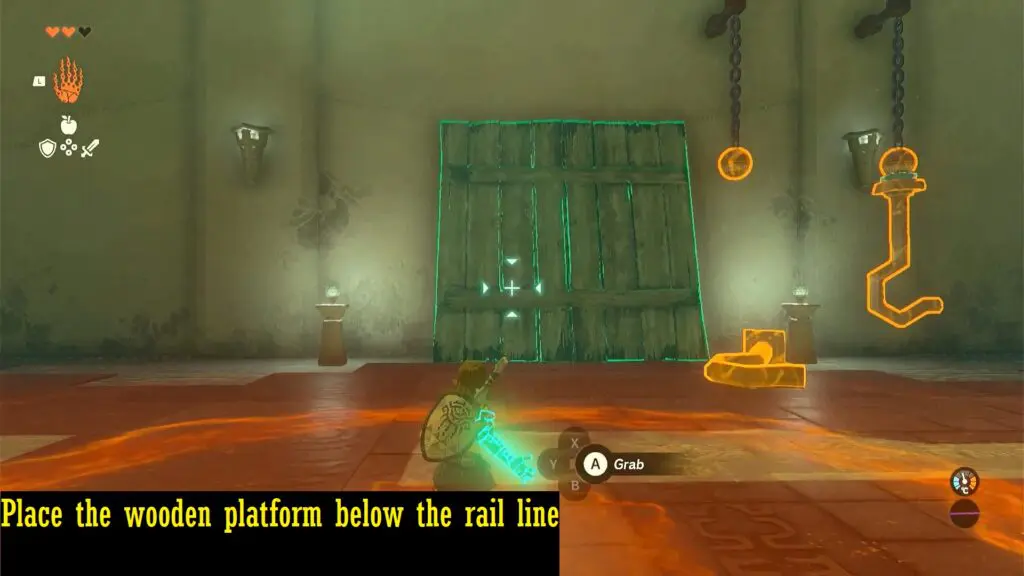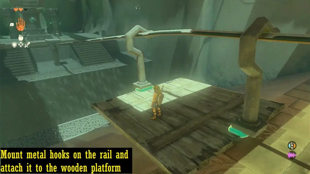 In the next area, players will come across a rail line that leads to the end of the shrine. Place the wooden platform below the rail line. Take one of the metal hooks, mount it on the rail and attach it to the wooden platform.