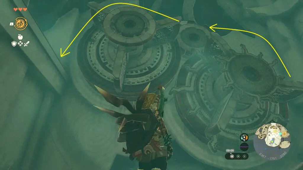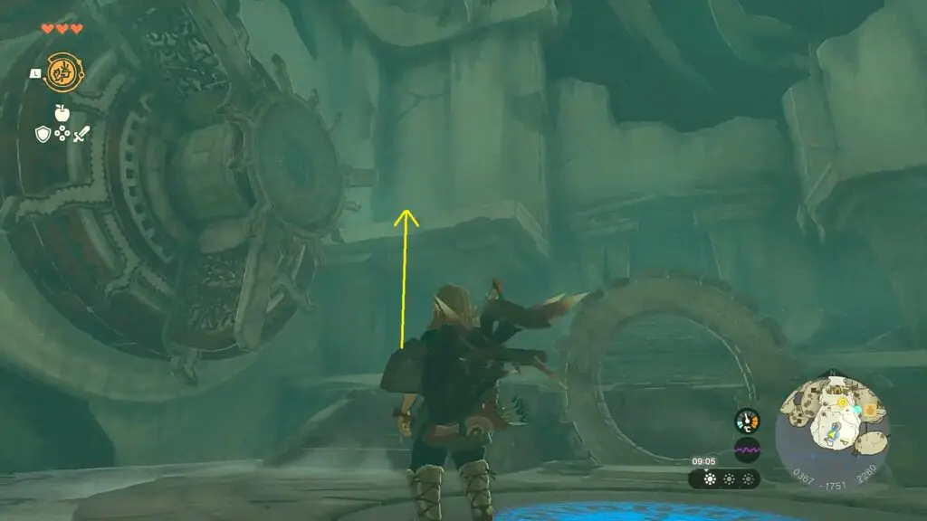 At the top, use the rewind ability on the wheel as shown in the picture below, and use it to reach the platform above. Open the chest there to get Arrow x10.