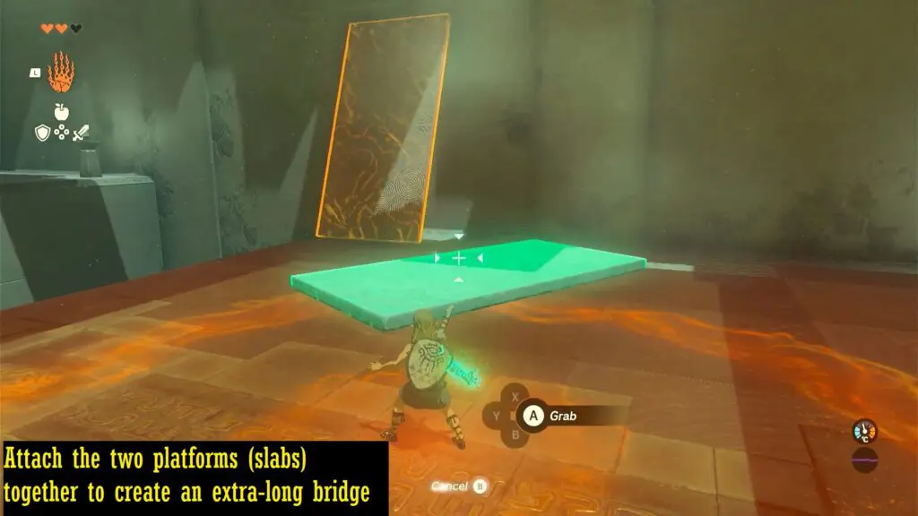 For the next section, you have to attach the two platforms (slabs) together using Ultrahand to create an extra-long bridge. Place it down above the gap to serve as a bridge.