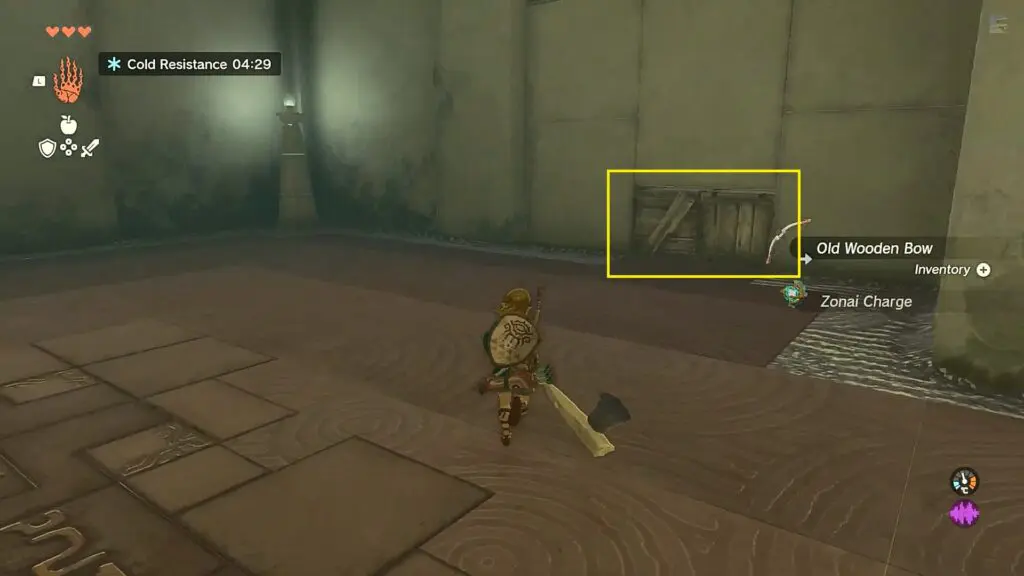 Defeat the enemy there. Then break the wooden blockage on the right side wall as shown in the picture below. Now ascend up to reach a chest. Open it to get a Bow.