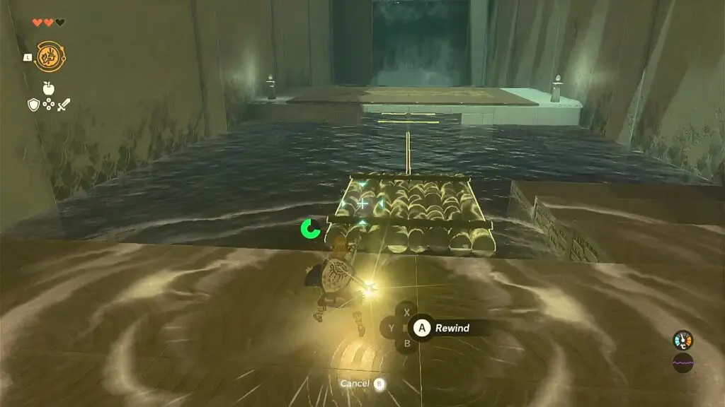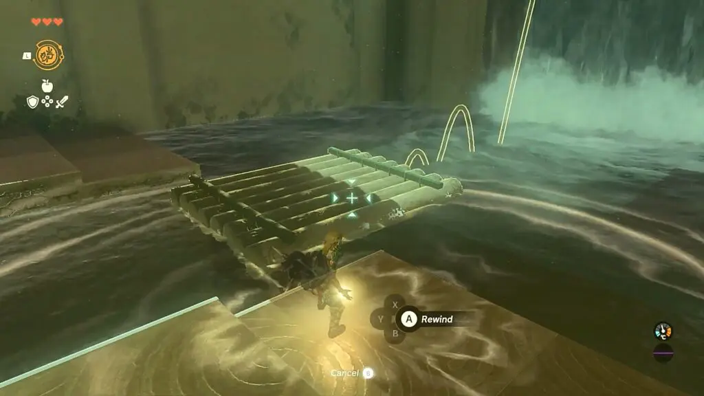 As soon as you enter the shrine, proceed ahead and use the rewind ability on the raft as shown in the picture below. Then jump on the raft to reach the other side.