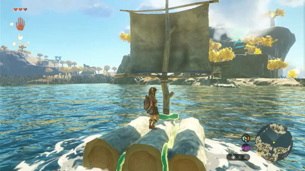 Enter the Ponside Cave and come out from the north side as shown in the pictures below. After coming out, use the Ultrahand ability to combine three logs and two fans to form a boat as shown in the second picture below. Place the boat into the water. Hop onto the boat. Then hit the fan with a sword. This will make the fan rotate and propel the boat forward, taking you to the other side.