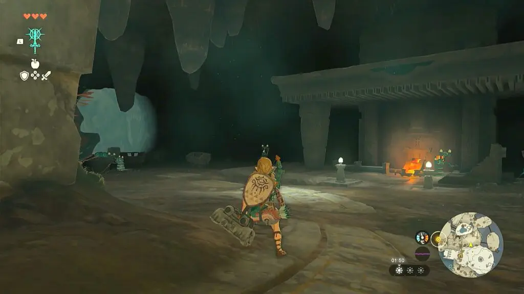 Proceed inside the cave. It will be completely dark inside the cave. Use Giant Brightbloom Seed to light up the cave. Keep going ahead until you reach the forge as shown in the picture below. You can use the forge to process Zonaite ore into Zonai Charges and Crystallized Charges.