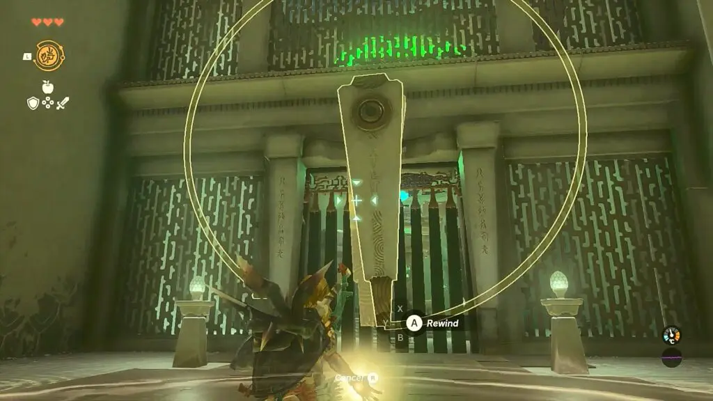 Enter the Temple of Time and interact with the altar in the front to get the Rewind ability. Once you have the Rewind ability, use it on the wheel as shown in the picture below. Then quickly jump on the wheel to reach the pedestal at the center. Now use the rewind ability on the wheel behind the pedestal as shown in the picture below and use it to reach the platform ahead.
