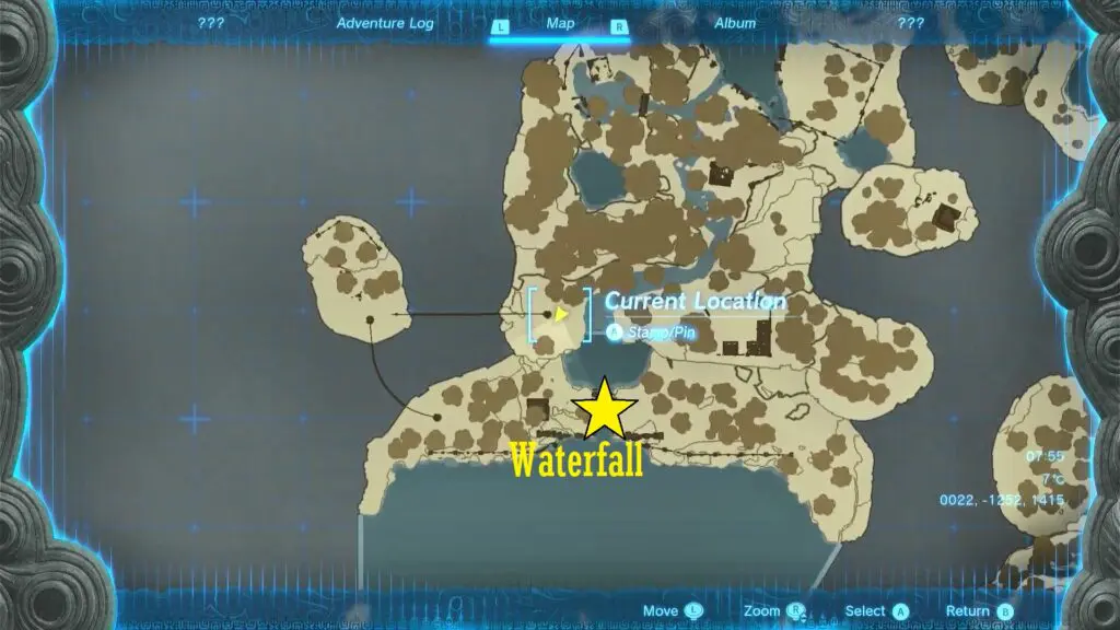 Continue traveling south after crossing the bridge until you get to a waterfall. Drop down near the waterfall. The next step is to construct a temporary boat by horizontally joining at least two trunks and placing a vertical sail in the center.