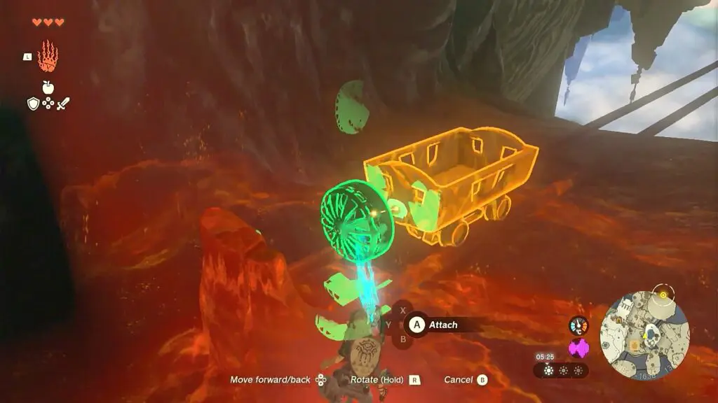 Now go to the opening near the forge. Talk to the Mining Construct there and he will give you three fans. Now use the Ultrahand ability to place a Mine Cart on the rails as shown in the picture below. Then attach a fan to the mine cart. Now climb up the Mine Cart and hit the fan with a sword. This will make the fan rotate, propelling the cart forward. The cart will take you to the top of the mountain at the location shown in the second picture below.
