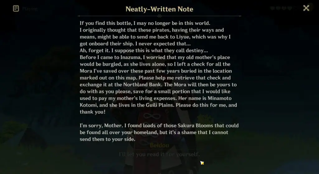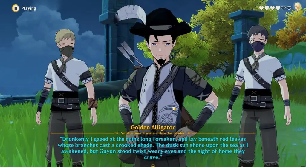 After the investigation is over, the treasure hoarders will tell you a poem containing the clue for the treasure location. After this, go east and jump down for a cutscene to start, in which the Treasure hoarders will tell you that this is the “ruins long forsaken”.