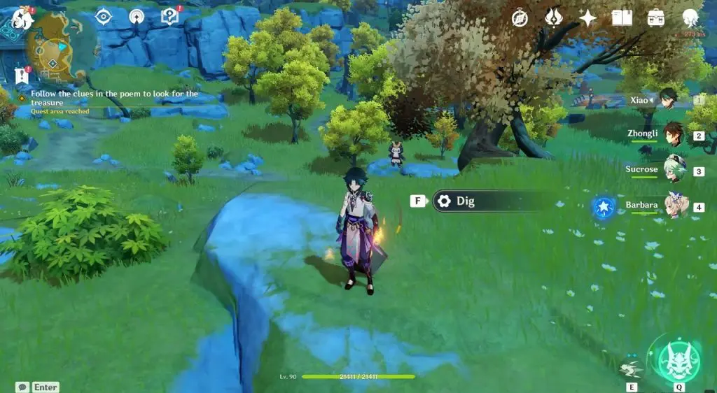 Go to the nest investigation area, where you will find a few Hilichurls digging for treasure as shown below. Defeat them and interact with the rock to complete this investigation.