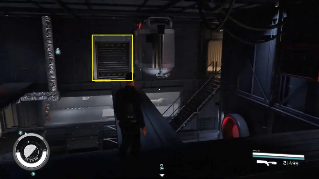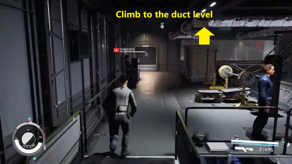 Turn around and walk a little further, then scale the box to get access to the duct level near some gym equipment.