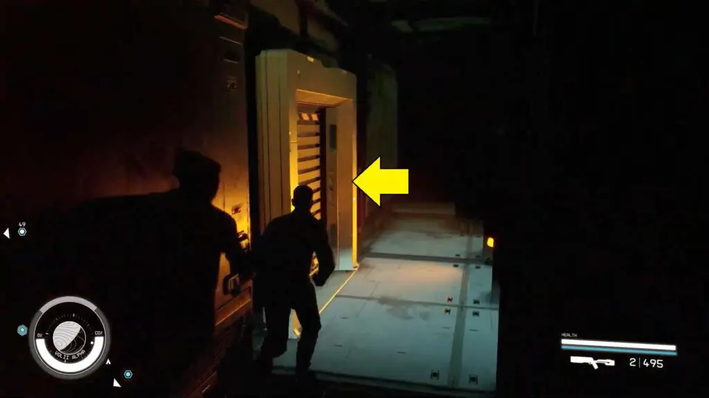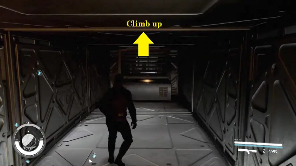 Move along the duct level and access the vent. After entering, proceed a short distance and ascend through the opening within the vent.