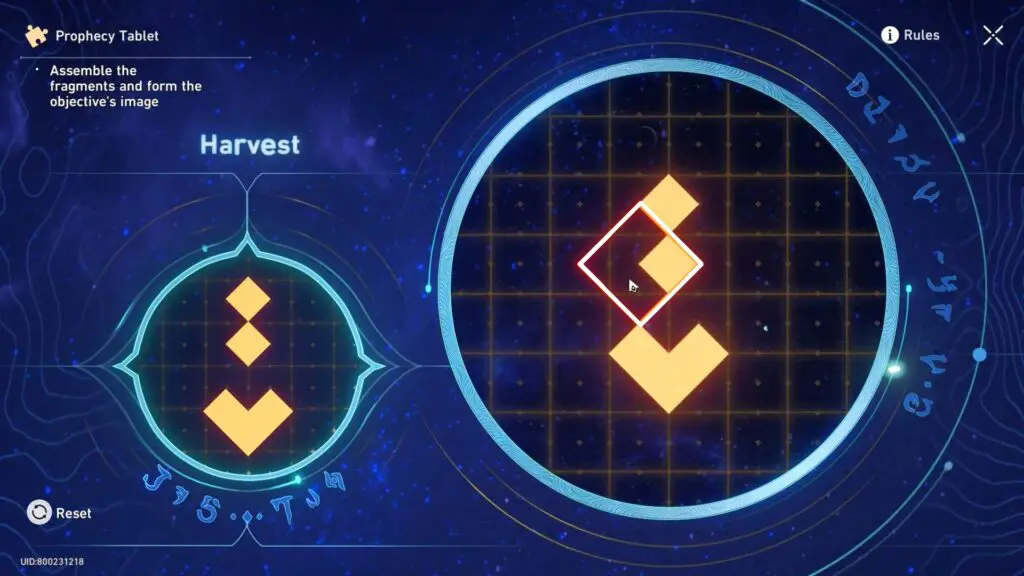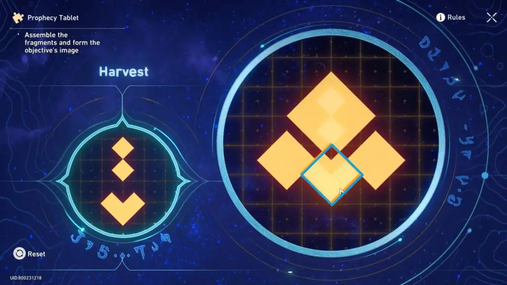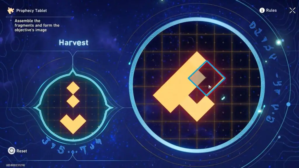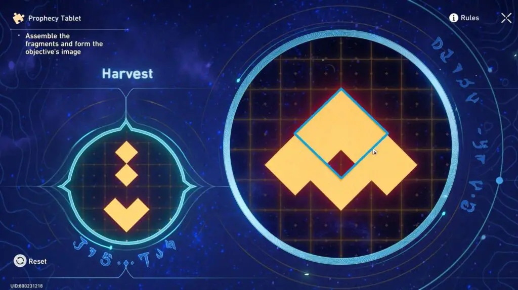 To solve the Prophecy Tablet Puzzle, the player has to arrange fragments to match the pattern shown on the left and align them with the base image. As you move the fragments, any parts that overlap will temporarily disappear. However, if you separate the fragments the hidden parts will reappear. The goal of solving the Prophecy Tablet Puzzle is to carefully combine and position the fragments to recreate the correct image and complete the puzzle.