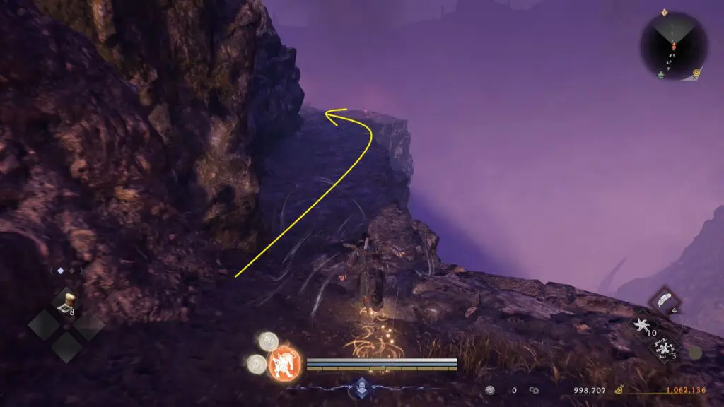 Keep going until you reach the end of the rocky section. From here, follow the narrow path that runs along the cliff edge. Stay close to the wall and move carefully as the trail bends.
