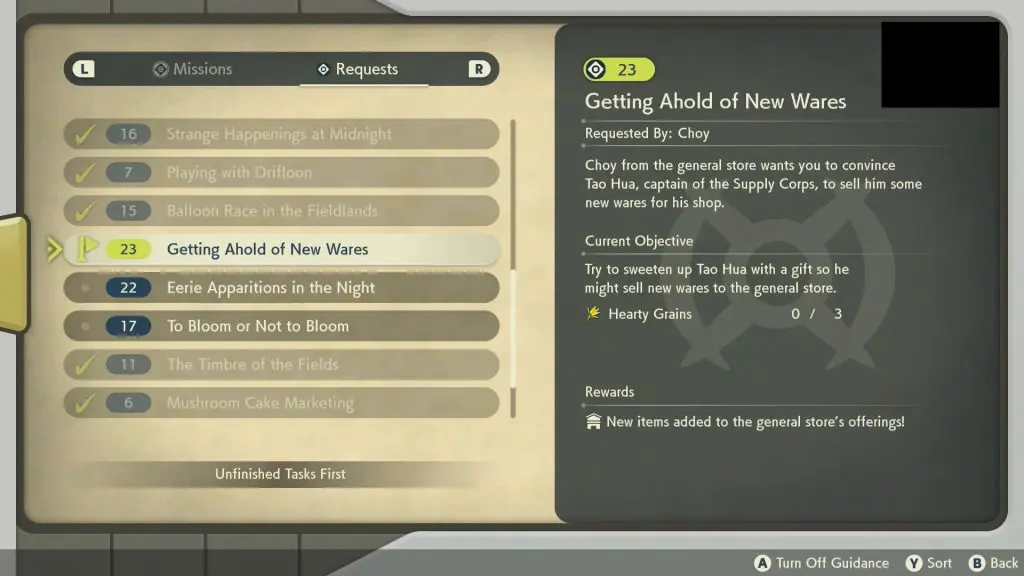 This guide shows the complete walkthrough of “Request 23: Getting Ahold of New Wares” in Pokemon Legends Arceus. For this request, you will need to get 3 Heart Grains.