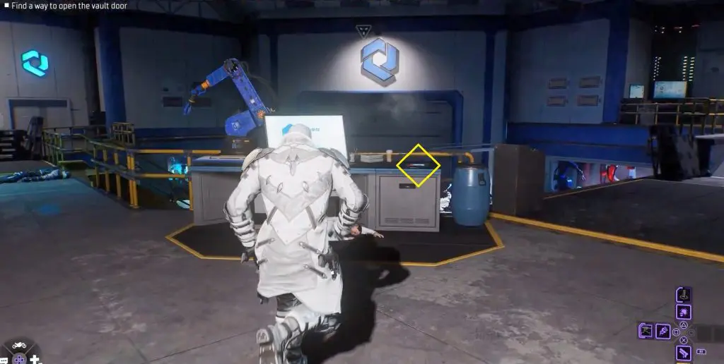 Enter the vault. Scan the torn blueprint on the left side’s wall.