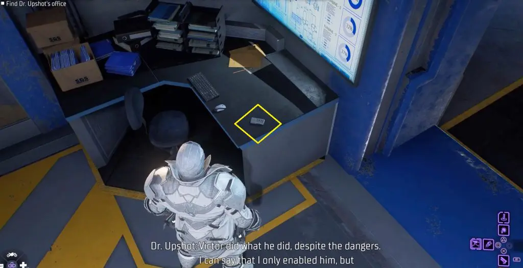 Once you get the objective, take the stairs to the upper floor and analyze the console on a table to open the vault as shown in the picture below. Then eliminate the enemies that come out.