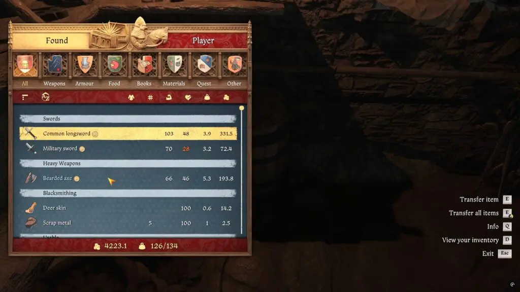 Examine the barrel in the corner to collect three low-sharpness weapons, such as the Common Longsword, Military Sword, and Bearded Axe. Be sure to choose only weapons that can be repaired at the Sharpening Wheel.