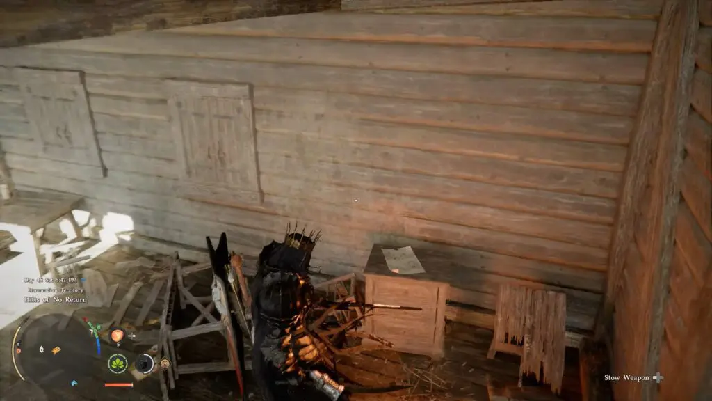 As you approach the hut, you’ll notice that the entrance is blocked by a barricade. Break through the barricade and clear the way inside.