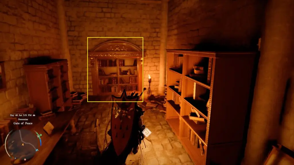 Once inside, go down the stairs until you reach a room filled with bookshelves. Look closely at the shelves and interact with one of them to rotate it. This will reveal a hidden passage behind it.