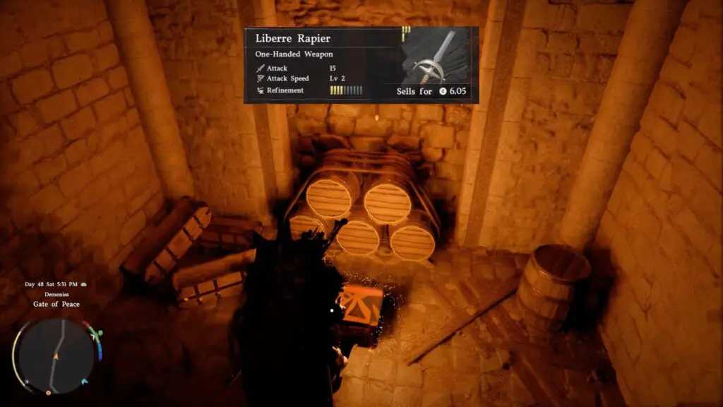 Go through the secret passage to enter a hidden room. Inside, you’ll find a treasure chest. Open it to obtain the one-handed sword Liberre Rapier.