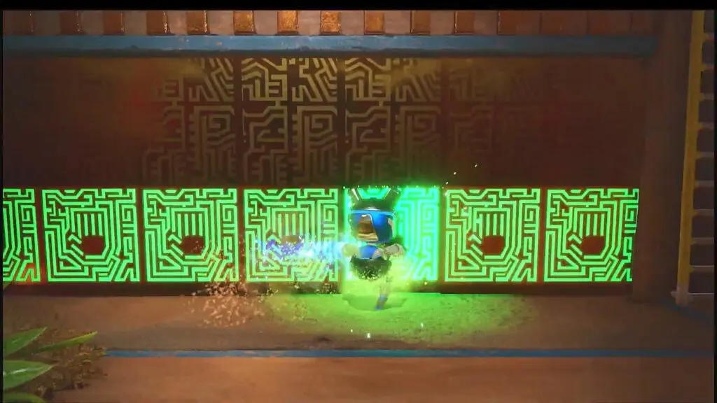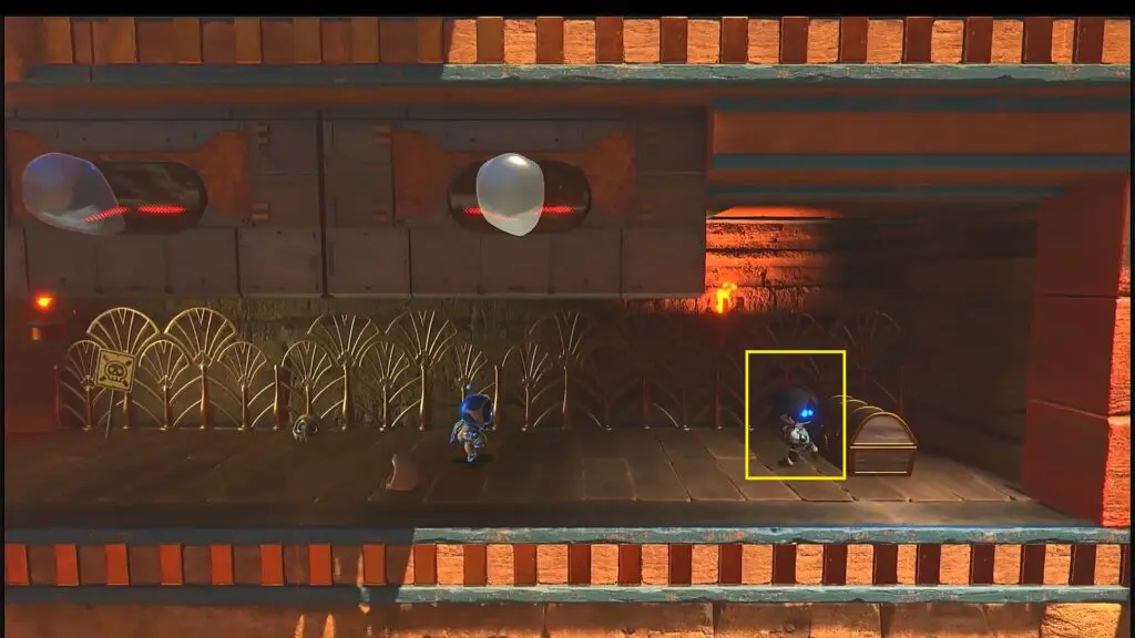 Proceed ahead and soon you will reach some crushing blocks. Go to the last crushing block and destroy the barrels there as shown in the picture below. Underneath one of those barrels, you will find a blue light. Stand on the blue light and spin to reach the area underneath. There you will find the bot as shown in the second picture below. You need to walk slowly there so that the blocks do not become active and crush you.