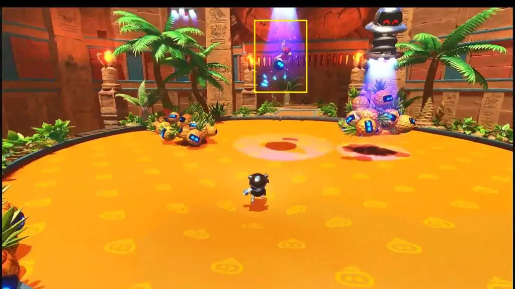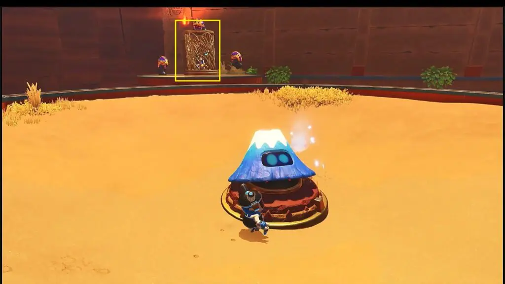 After using the second blue volcano, you will reach a golf hole. There you will find a rotating blue volcano. Rotate the volcano such that it points towards the caged bot as shown in the picture below. Now use the blue volcano and it will send you crashing into the cage. This will break the cage, rescuing the bot.