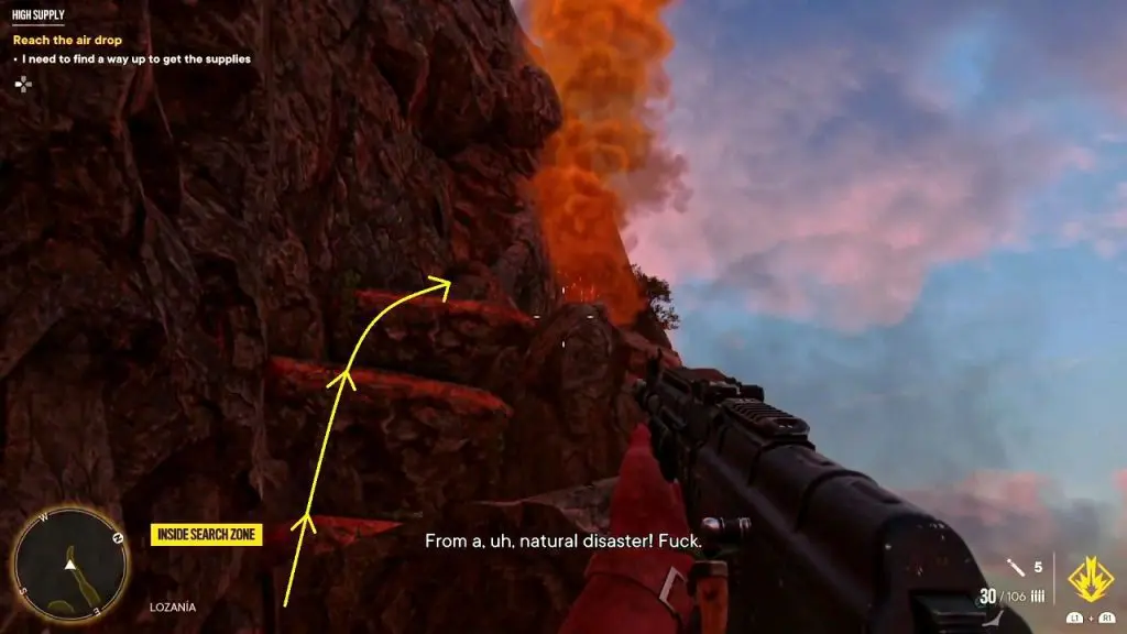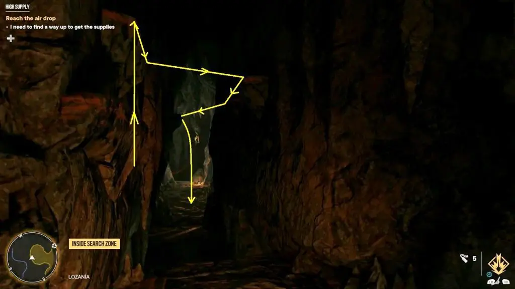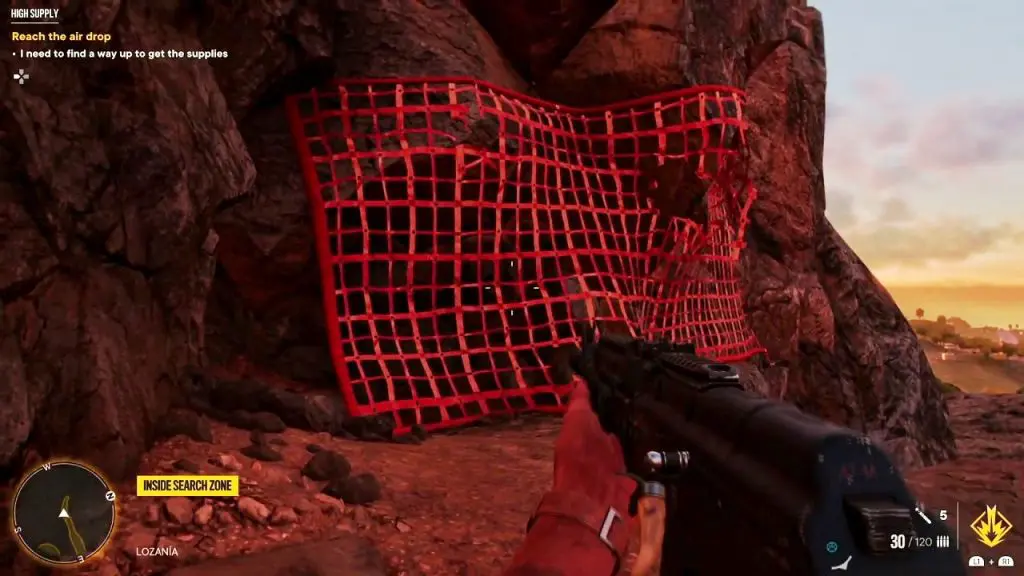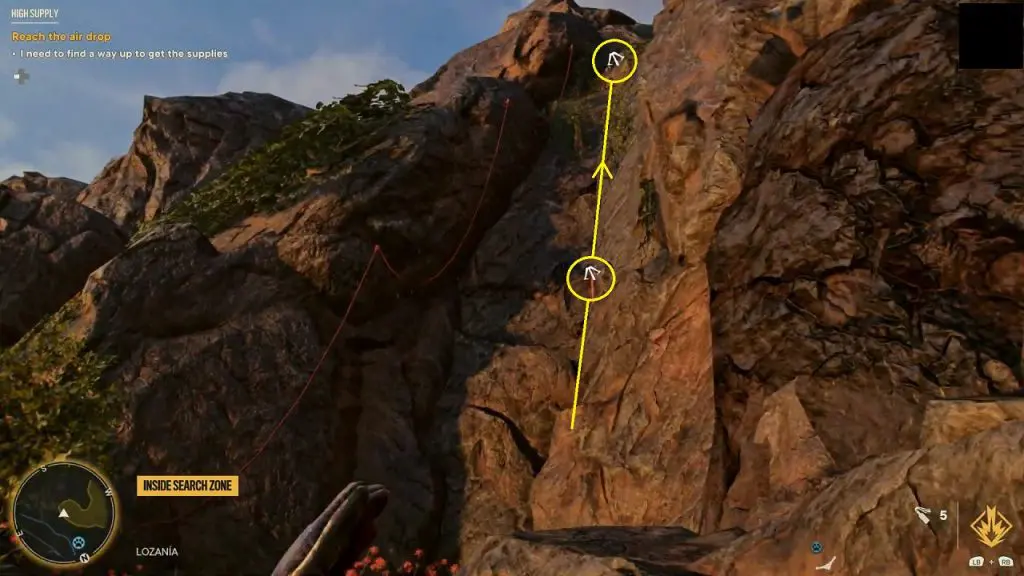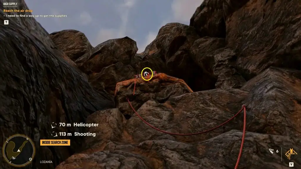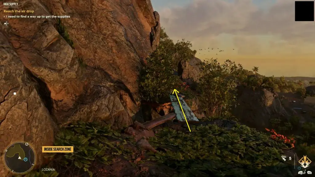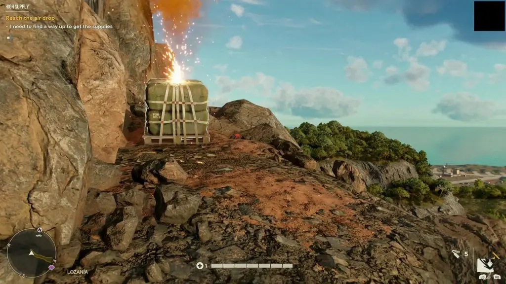 After the path is clear, climb up the rocks and reach the air drop as shown below. Pick up the supply drop to complete the treasure hunt.