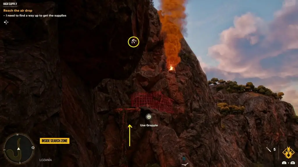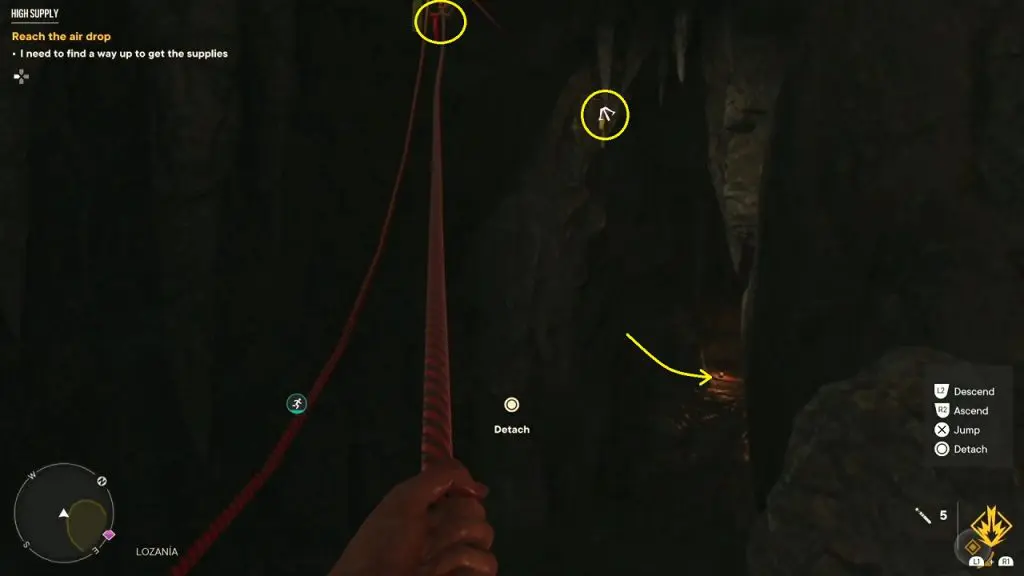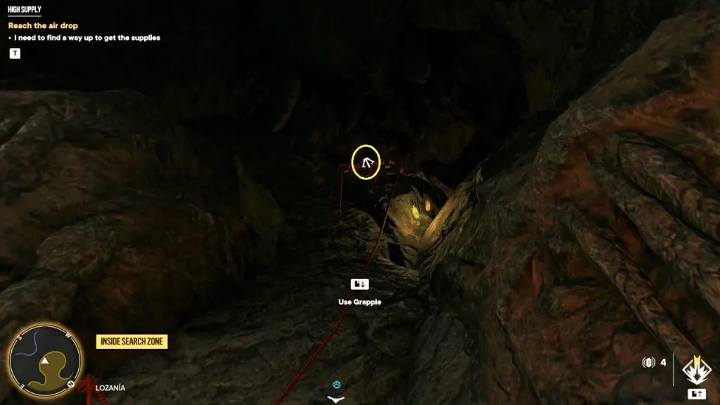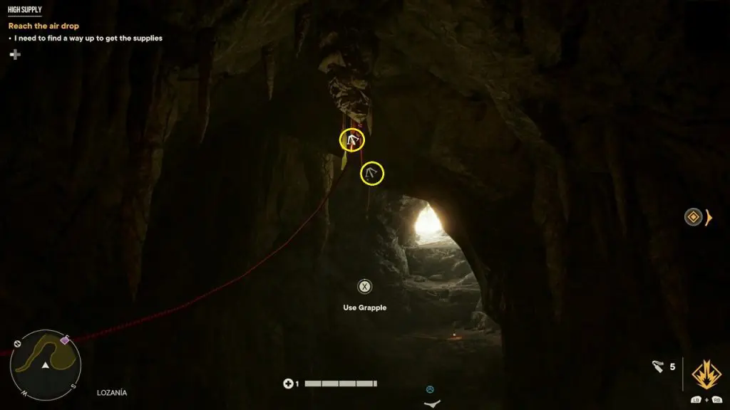 The path will lead you to a cave, where you will find a grappling point as shown below. Use grapple to climb up.