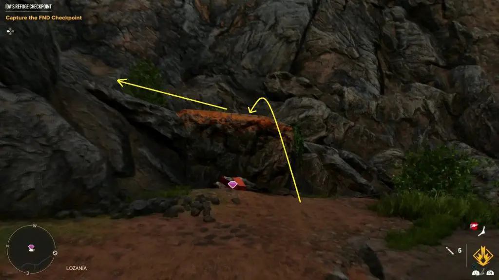 As you proceed ahead in the left direction, you will have to jump across a few gaps on the ground and climb a few rocks. At the end of the path, you will see a couple of grappling points as shown below. Grapple to climb up the mountain.