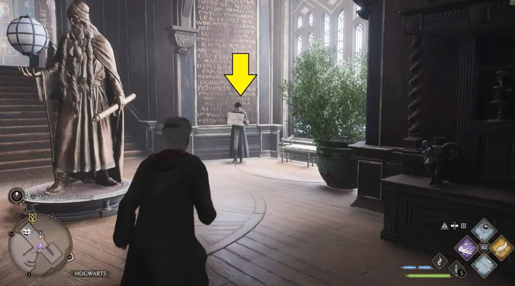 You can find Arthur Pummly next to the large statue outside the Charms Classroom in The Astronomy Wing. It is one floor above Professor Fig’s Classroom. Arthur will provide you with one of the treasure maps. The treasure map’s three main features: A Rhinoceros statue, A Dragon fountain, and a Door. To find the treasure, you’ll need to visit each of these three locations.