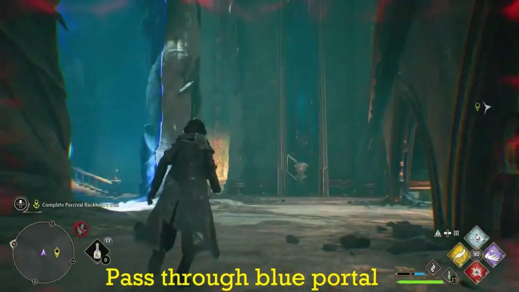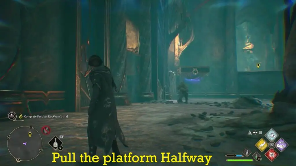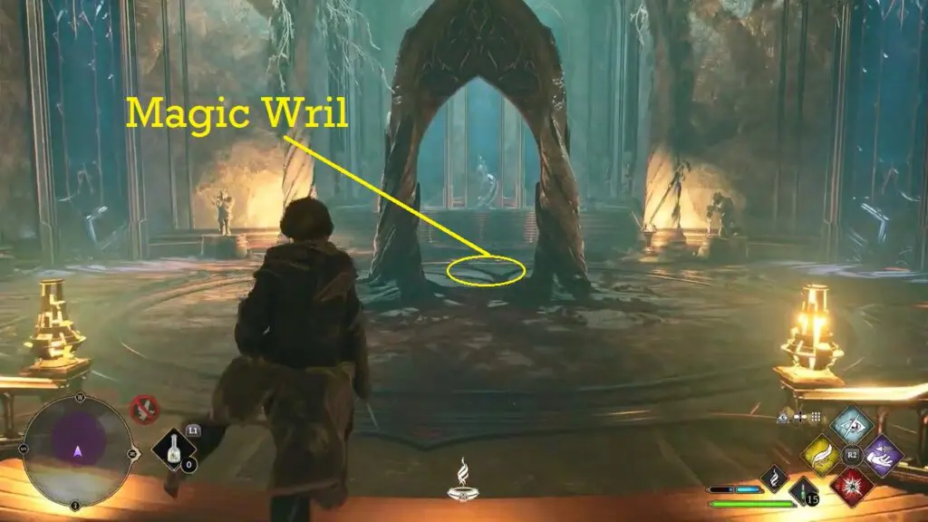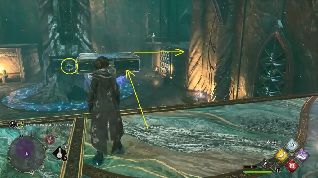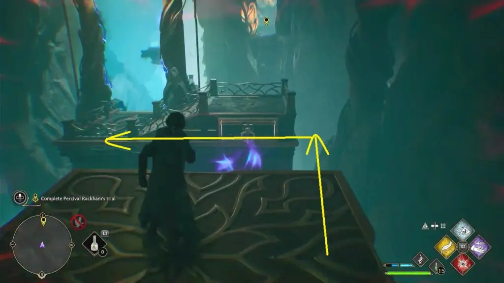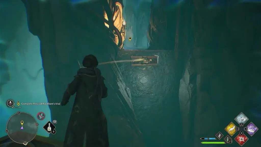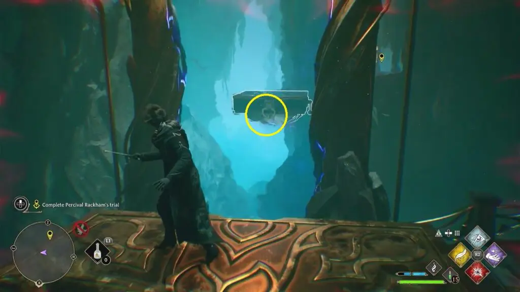 Stand at the ledge’s edge to observe some ancient magic light whirl. Pull the floating platform over to you with Accio. Step on the floating platform and activate the well that appears. This will activate the portal between rock pillars.