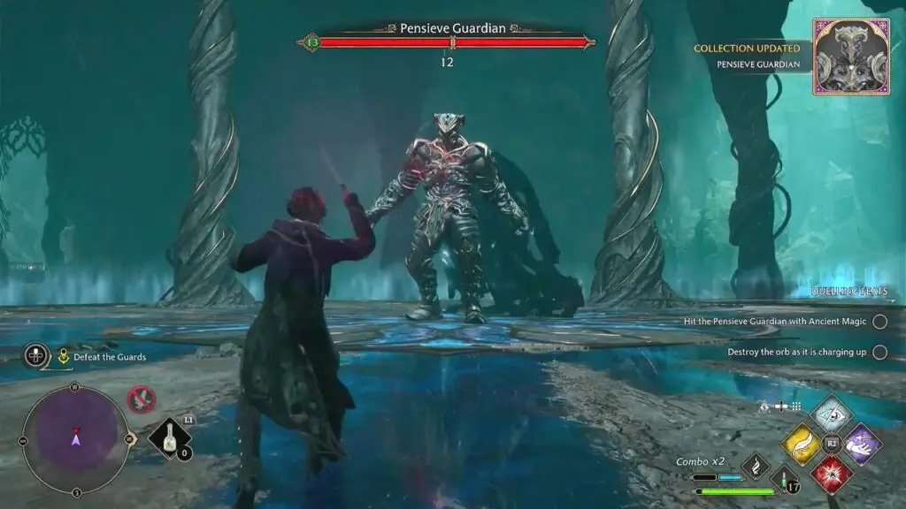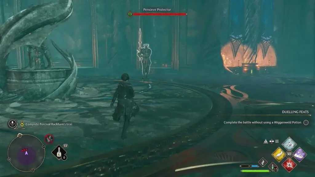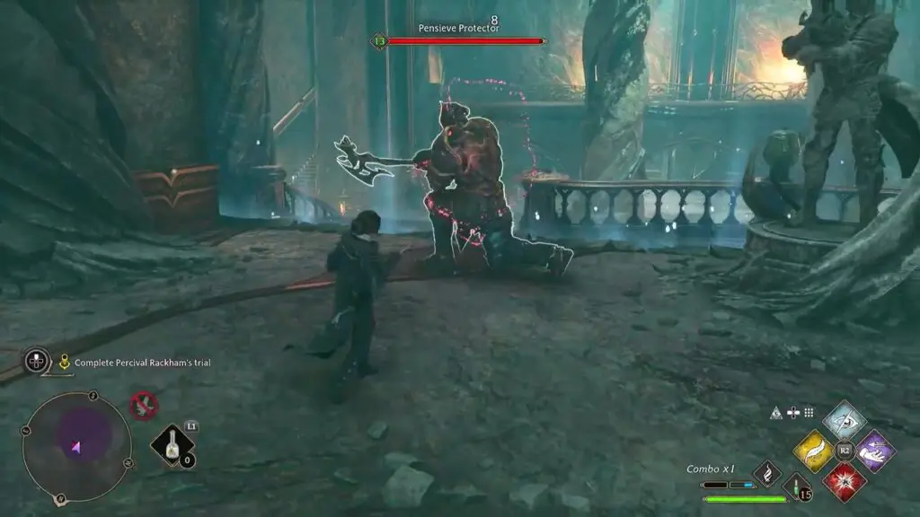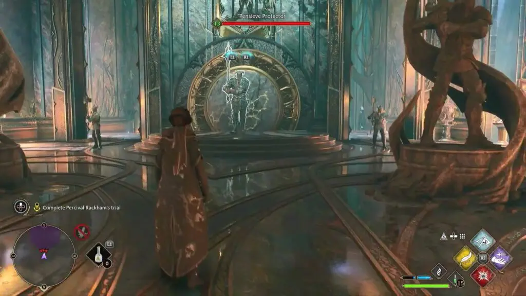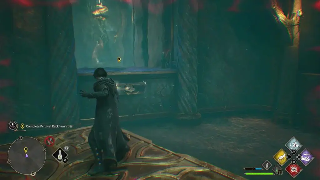 Continue to follow the quest marker into the final room. Approach the Pensieve Rackham’s memories and interact to start a cut scene.