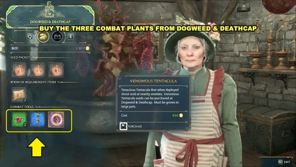 Enter the plant shop at Dogweed and Deathcap and talk to the shopkeeper, Beatrice Green. Here you can buy Venomous Tentacle for 600 Galleons, Mandrake for 500 Galleons, and Chinese Chomping Cabbages for 500 Galleons. Don’t bother buying them as seeds, the Combat Tools will be enough.