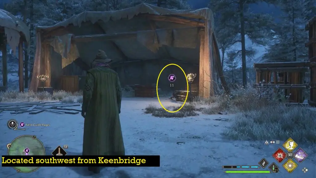 Head southwest from Keenbridge to the marked location and cast revelio near the chest and torch to see the field page.
