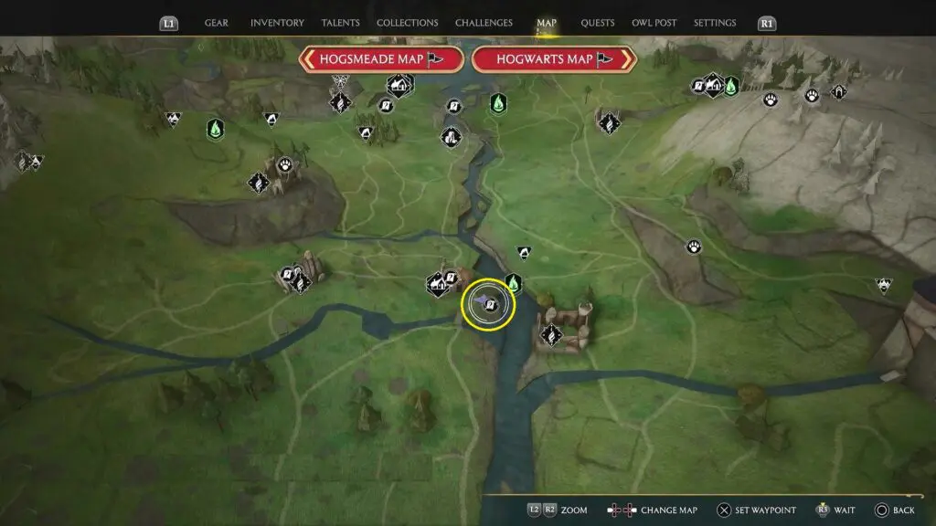 Fast travel to the Central Hogwarts valley Floo Flames and then fly to the opposite side of the river as indicated on the map.