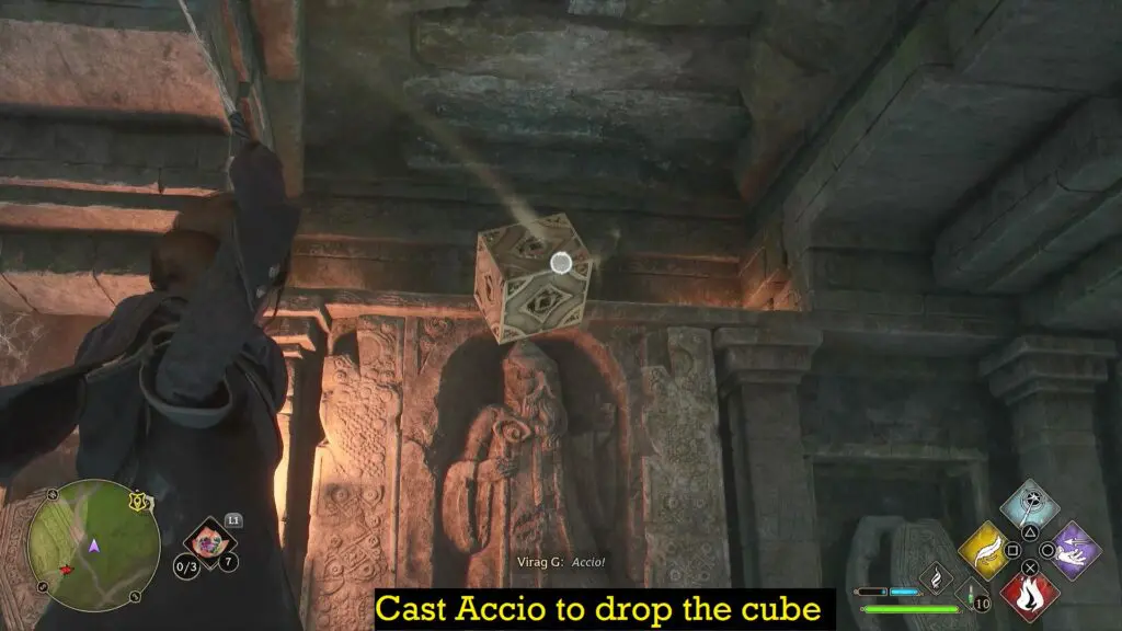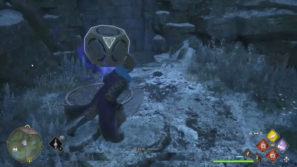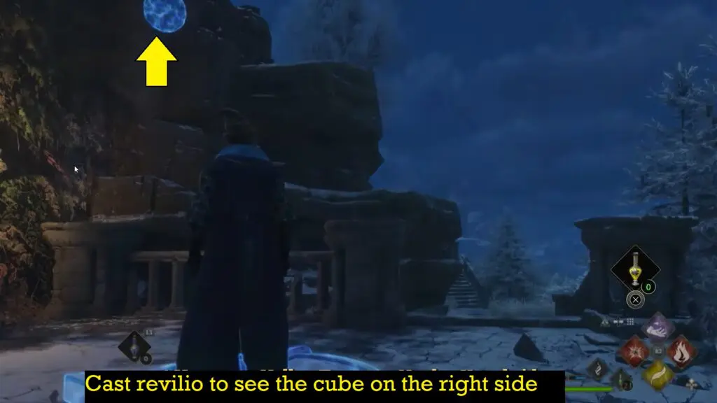 Use revelio spell to see the cube on the right side up on the mountain.