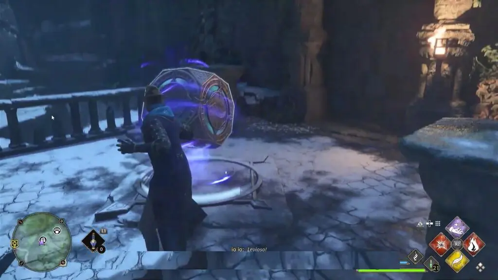 Use Wingardium Leviosa to a cube lying nearby on the platform. Use Levioso on the nearby box to climb up the ledge.